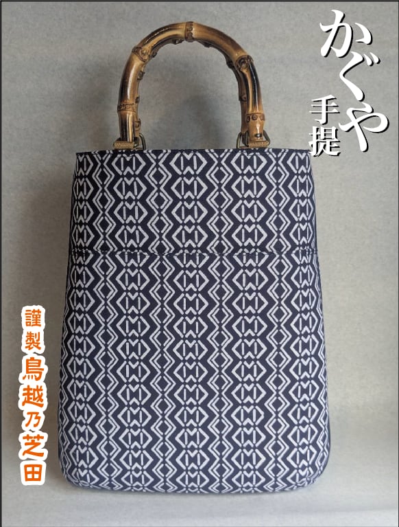 鳥越乃芝田が温めておいた厳選生地をかぐや手提として仕立てました。